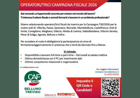 Il Caf Cisl Belluno Treviso è alla ricerca di professionalità da inserire nel proprio staff