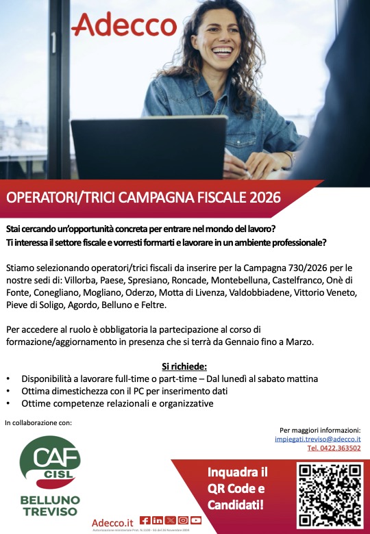 Ti interessa il settore fiscale e desideri formarti in un ambiente professionale e strutturato? Siamo alla ricerca di operatori e operatrici fiscali da inserire nella campagna 730/2026 nelle nostre sedi di: Villorba, Paese, Spresiano, Roncade, Montebelluna, Castelfranco, Onè di Fonte, Conegliano, Mogliano, Oderzo, Motta di Livenza, Valdobbiadene, Vittorio Veneto, Pieve di Soligo, Agordo, Belluno e Feltre. Per accedere al ruolo è obbligatoria la partecipazione al corso di formazione/aggiornamento in presenza, che si svolgerà da gennaio a marzo. Requisiti richiesti: • Disponibilità a lavorare full-time o part-time, dal lunedì al sabato mattina Per maggiori informazioni: