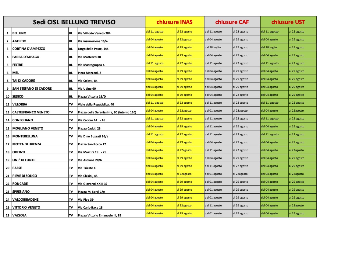 Si informa che, in occasione della pausa estiva, le sedi della Cisl Belluno Treviso di Villorba (Treviso), Belluno, Montebelluna, Conegliano e Feltre saranno chiuse da lunedì 11 agosto a venerdì 22 agosto. Le attività, in questi uffici, riprenderanno regolarmente lunedì 25 agosto. Per quanto riguarda le altre sedi, questo il calendario estivo di chiusure e aperture: Agosto 2025: orari estivi delle sedi Cisl